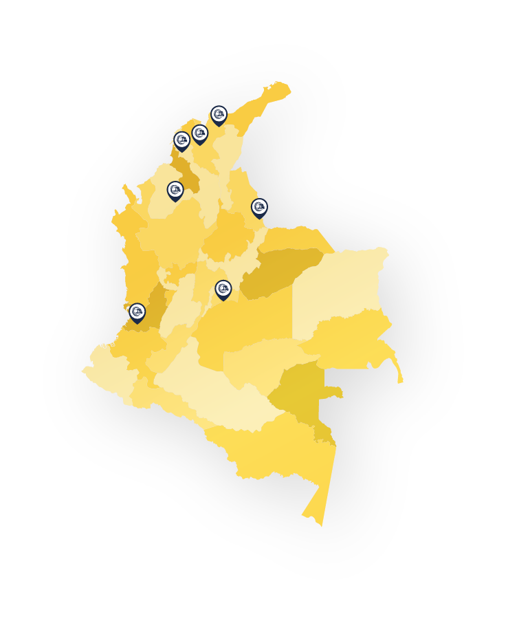 Contamos con sedes estratégicas en: Bogotá, Medellín, Barranquilla, Cúcuta, Bucaramanga, Cali y Cartagena, cubriendo las principales rutas de transporte terrestre y puertos del país.